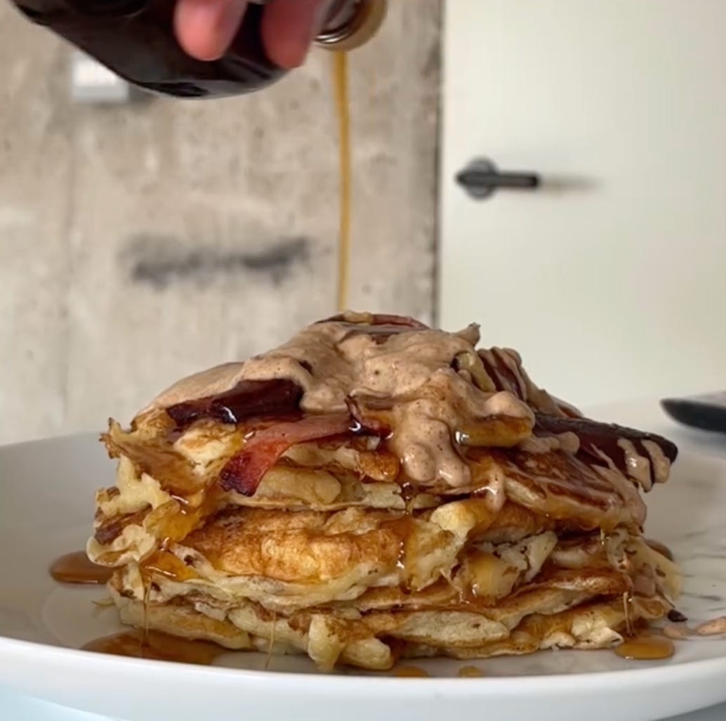 Proper thick pancakes as the base. Crispy bacon. Banana fried in butter and cinnamon. Peanut butter loosened with maple syrup so it drizzles. And then more maple syrup over everything. Completely excessive and, aside from the caramelisation, properly unpretentious food-based fun.